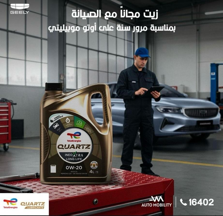 بمناسبة مرور عام على الإطلاق الرسمي لشركة أوتو موبيليتي، الوكيل والمصنع الرسمي لسيارات جيلي في مصر، قررت الشركة، بالتعاون مع توتال إنرجيز التسويق إيجيبت، منح عملائها من مالكي سيارات جيلي زيت مجاني وهدية عند قيامهم بالصيانة الدورية لسياراتهم.