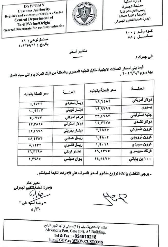 الحالي، وللمرة الثانية منذ بداية العام الحالي، تقرر مصلحة الجمارك التابعة لوزارة
