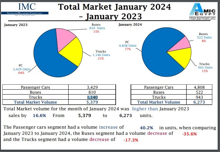 ووفقا لبيانات التقرير الصادر من مجلس معلومات سوق السيارات (أميك AMIC)، شهدت مبيعات سيارات الركوب في مصر نموا بنسبة 40.2% بعد تسجيل 4,808 سيارة خلال يناير 2024 مقابل 3,429 سيارة تم تسجيلها خلال يناير 2023.
