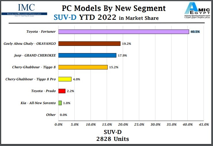 كشف التقرير الصادر عن مركز معلومات سوق السيارات "أميك" عن تصدر السيارة "تويوتا فورتشنر Fortuner" قائمة السيارات من فئة الـ SUV-D العائلية الأكثر مبيعا بالسوق المصري خلال الفترة من يناير وحتى أكتوبر العام الجاري.