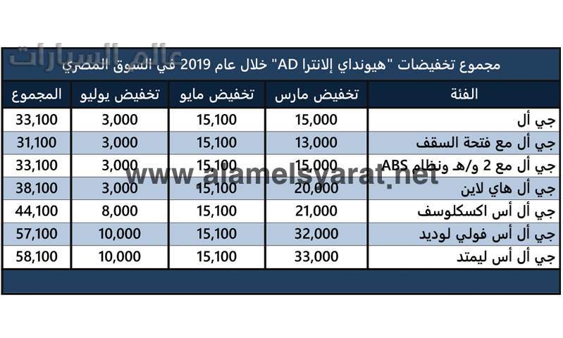 ومع تخفيضات "Elantra AD" الجديدة موديل 2019 فإن مجموع التخفيضات التي طبقت عليها يبدأ من نحو 31,100 حتى 58,100 ج. م. كما يوضح الجدول التالي: