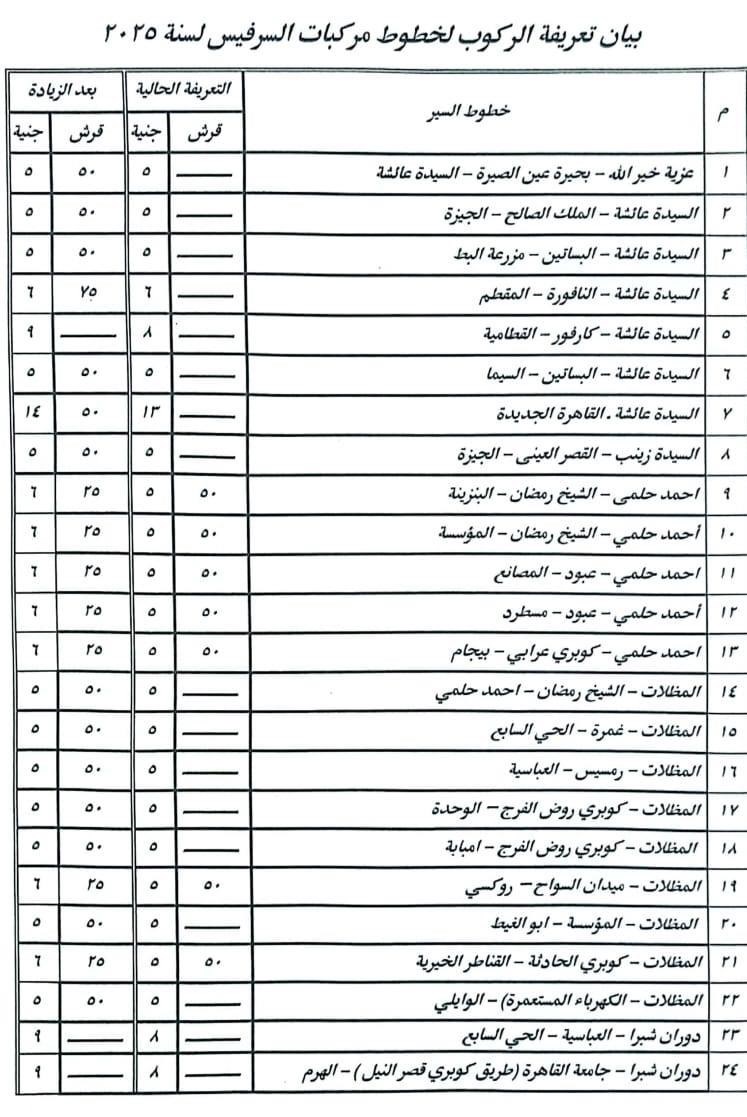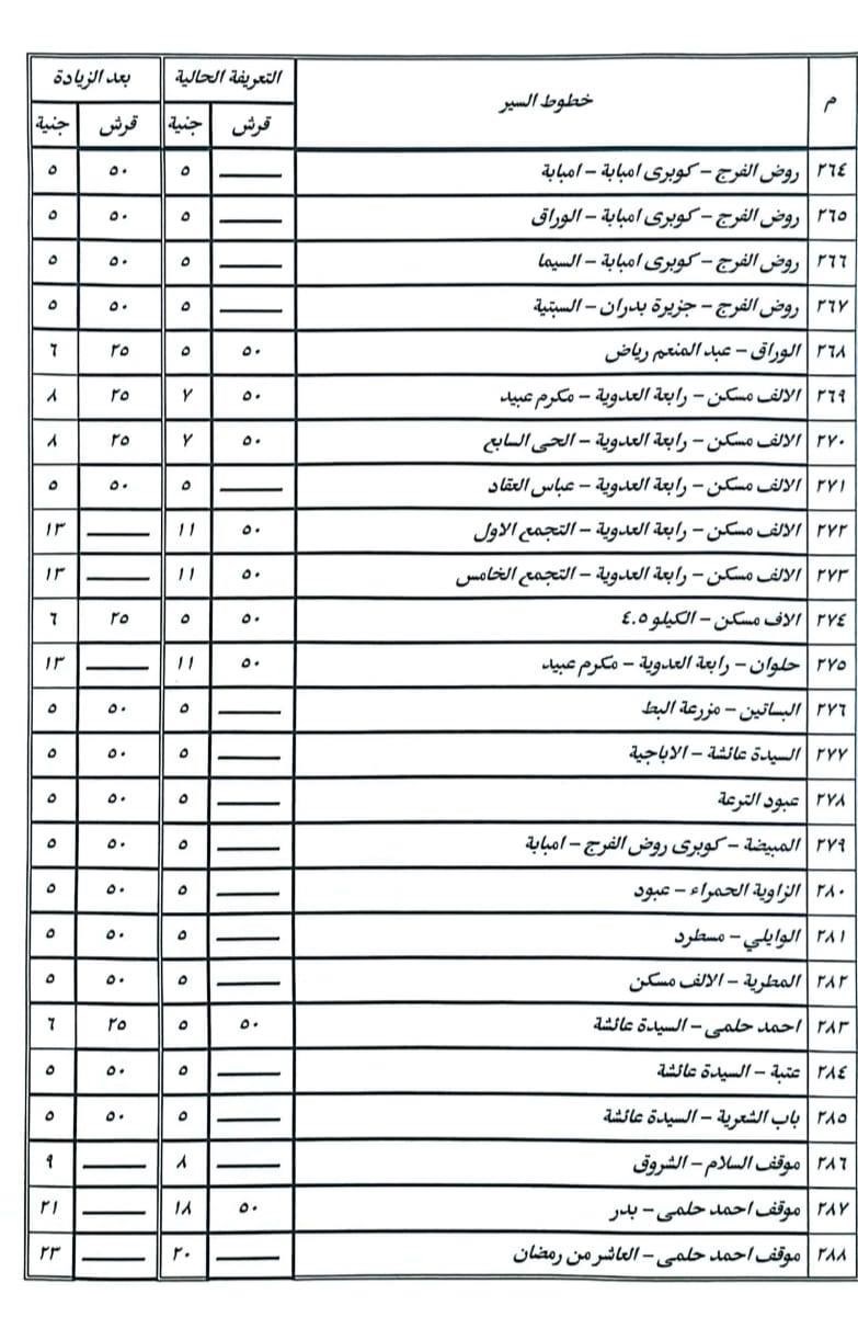 أعلنت صفحة الفيسبوك الرسمية لمحافظة القاهرة، صباح اليوم، عن تعديل تعريفة ركوب (سيارات السرفيس والنقل العام والنقل الجماعي والأقاليم والتاكسى الأبيض)، وذلك فى ضوء صدور قرار لجنة تسعير المنتجات البترولية بتعديل سعر البنزين والسولار.