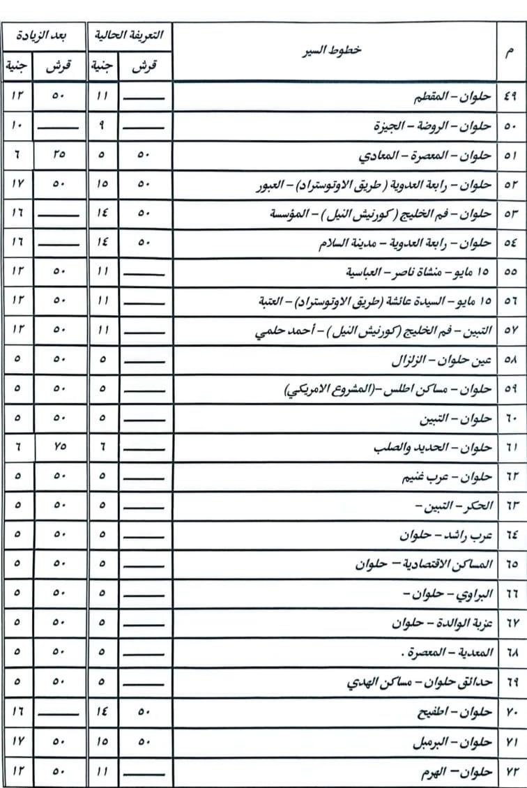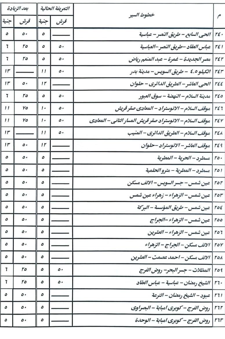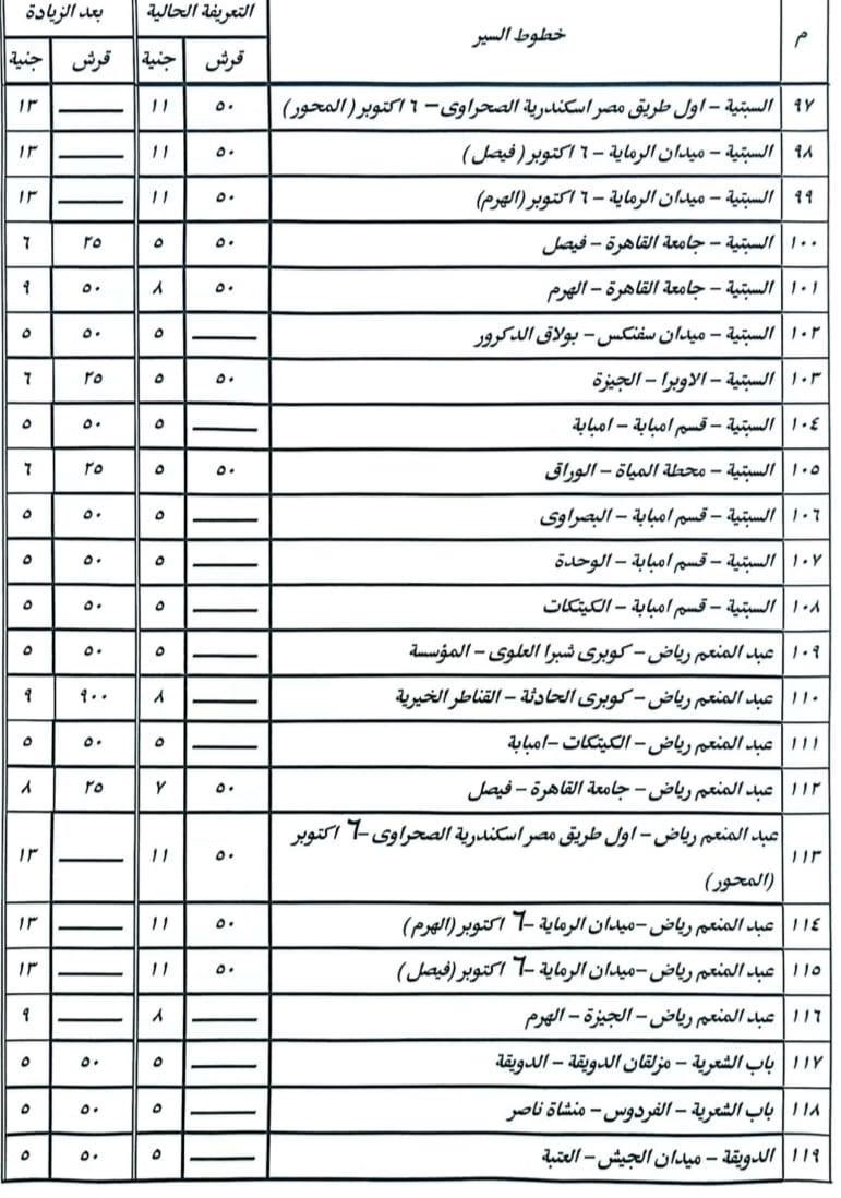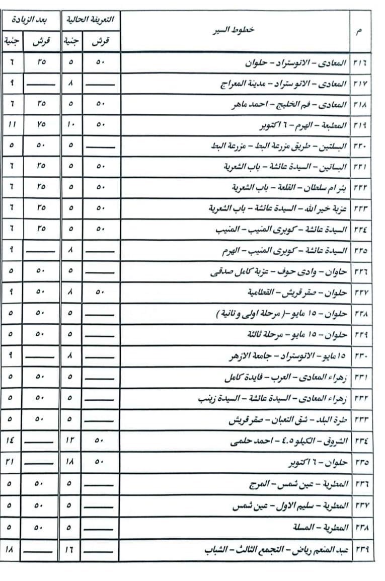 أشار الدكتور إبراهيم صابر محافظ القاهرة أن الزيادة نسبتها ١٠% على معظم الخطوط، ولم تتجاوز ١٥% فى الخطوط الطويلة، وقد تم نشر البنرات والملصقات التي تتضمن الأسعار الجديدة للتعريفة على مداخل جميع المواقف بصورة واضحة أمام المواطنين.