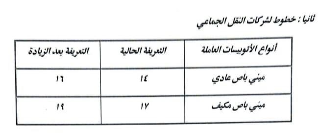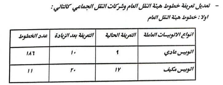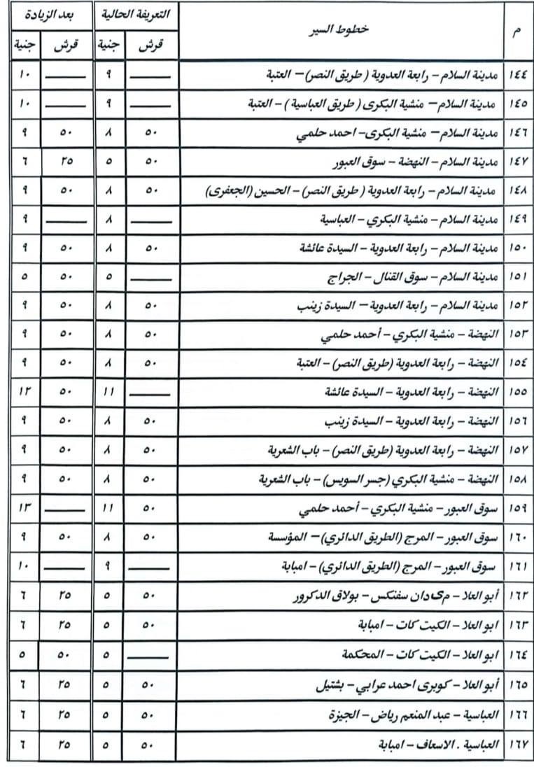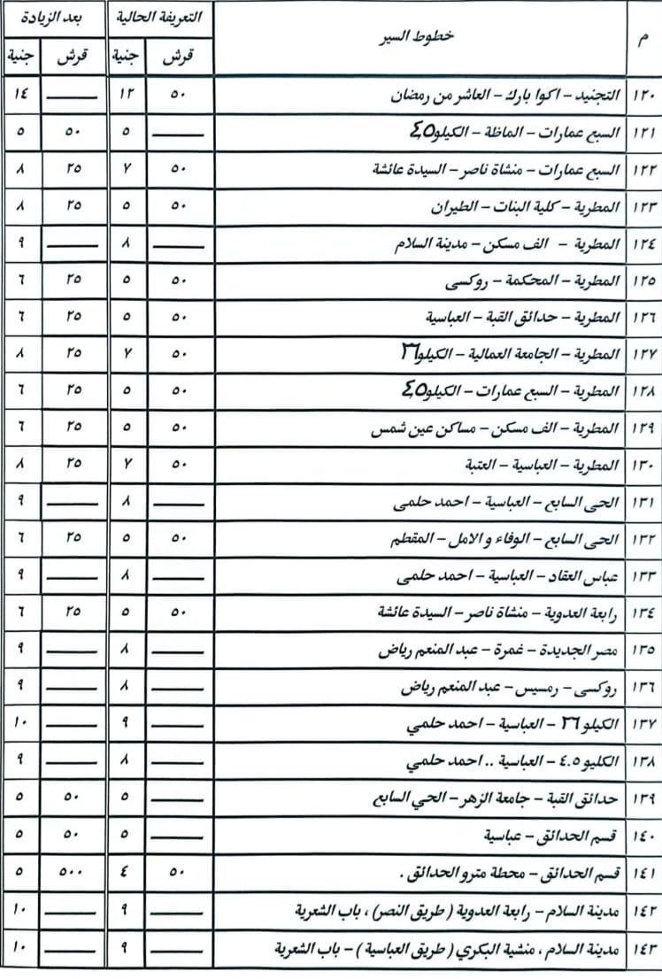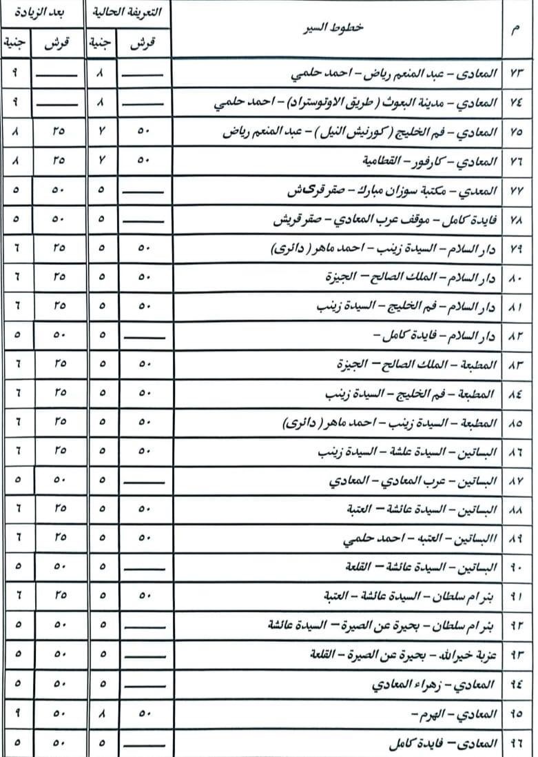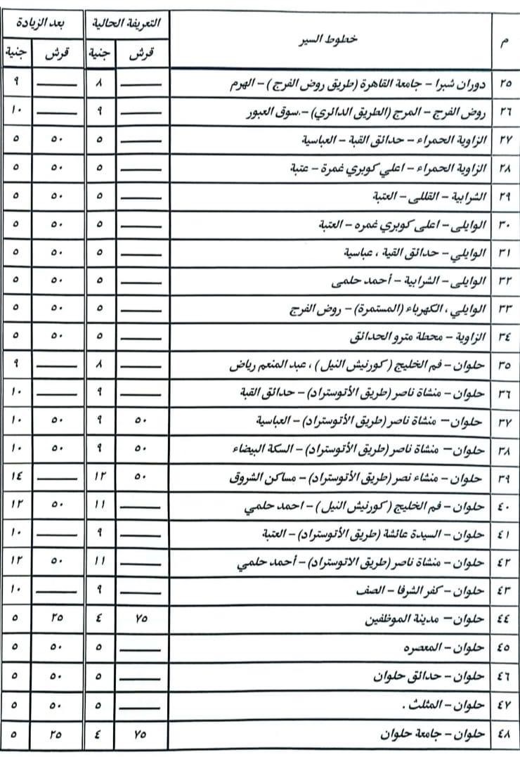 أشار الدكتور إبراهيم صابر محافظ القاهرة أن الزيادة نسبتها ١٠% على معظم الخطوط، ولم تتجاوز ١٥% فى الخطوط الطويلة، وقد تم نشر البنرات والملصقات التي تتضمن الأسعار الجديدة للتعريفة على مداخل جميع المواقف بصورة واضحة أمام المواطنين.