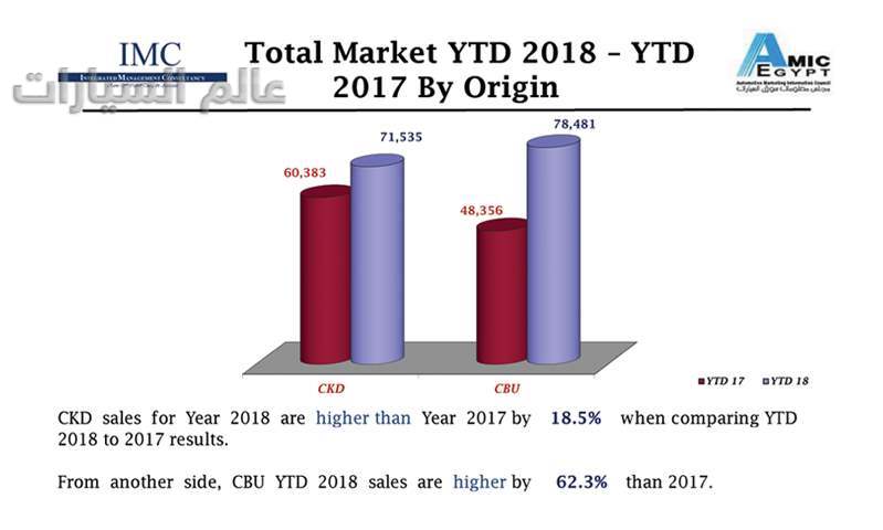 وبنهاية أكتوبر 2018, وصل مجموع مبيعات سيارات السوق المصري للعام الحالي منذ بداية يناير حتى نهاية أكتوبر إلى 150,016 وحدة منها 71,535 وحدة للسيارات المجمعة محلياً و78,481 وحدة للسيارات المستوردة. وذلك بزيادة بنسبة 18,5% للسيارات المجمعة محلياً و62,3% للسيارات المستوردة مقارنة بنفس الفترة من عام 2017 الماضي.