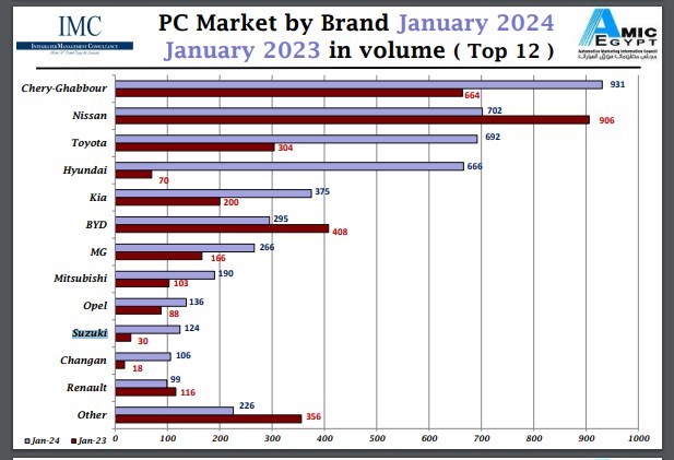 أما المركز العاشر والأخير بالقائمة فكان من نصيب العلامة اليابانية "سوزوكي Suzuki" حيث سجلت 124 سيارة مستحوذة على 3% من إجمالي المبيعات خلال يناير هذا العام مقابل 30 سيارة تم تسجيلها خلال نفس الشهر العام الماضي.