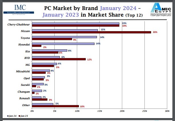 و احتلت العلامة اليابانية "تويوتا Toyota" المرتبة الثالثة بإجمالي 692 سيارة مستحوذة على 14% من الحصة السوقية وهو نمو ملحوظ مقارنة بشهر يناير عام 2023 الذي سجلت خلاله نحو 304 سيارة، وذلك بفضل سيارتها "كورولا NG" التي سجلت 606 سيارة، فيما جاءت العلامة الكورية "هيونداي Hyundai" في المرتبة الرابعة بعدما حققت 666 سيارة مستحوذة على 14% من إجمالي المبيعات وهو ارتفاع كبير مقارنة بـ 70 سيارة تم تسجيلها خلال يناير 2023، ويرجع ذلك إلى سيارتها المجمعة محليا "أكسنت RB" التي سجلت 650 سيارة.