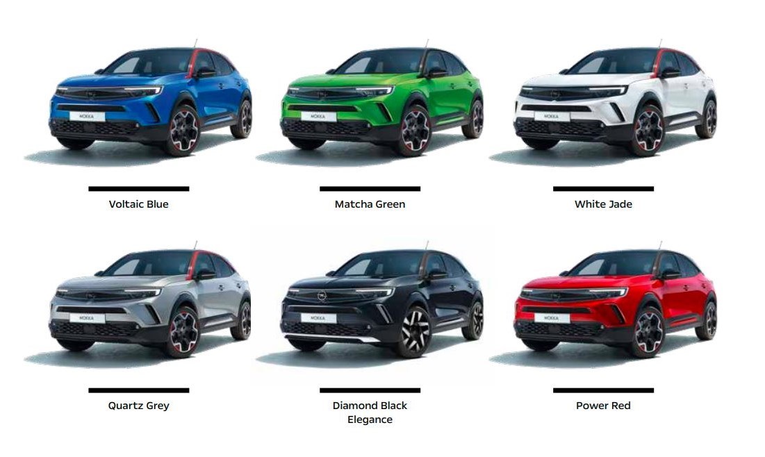 تتوفر أوبل موكا في 6 ألوان خارجية هم: (الأسود، الأبيض، الرمادي، الأزرق، الأحمر، الأخضر)، وتتفاوت التجهيزات الخارجية والداخلية بين الفئتين على النحو التالي: