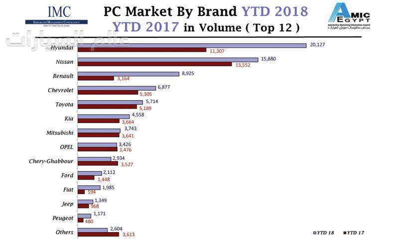 وتظل "هيونداي" على القمة بمبيعات 24017 وحدة, تليها "نيسان" بمبيعات 18019 وحدة, وبعدها "رينو" بمبيعات 10175 وحدة, ثم "شيفروليه" بمبيعات 8068 وحدة, ثم "تويوتا" بمبيعات 6523 وحدة, ثم "كيا" بمبيعات 5913 وحدة, ثم "ميتسوبيشي" بمبيعات 4268 وحدة, ثم "أوبل" بمبيعات 3881 وحدة, ثم "شيري" بمبيعات 3505 وحدة, وأخيراً "فورد" بمبيعات 2460 وحدة تبعاً لترتيب العشر الأوائل.
