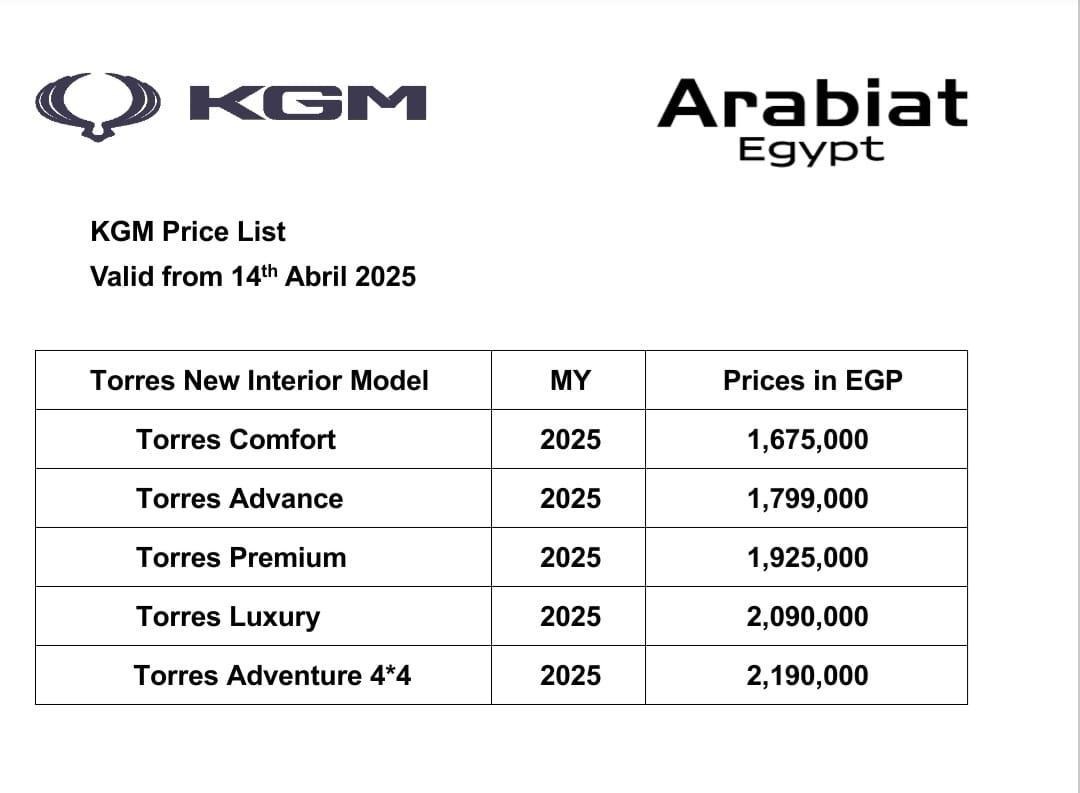 ومن ناحية أخرى أعلنت عربيات إيجيبت الوكيل الحصري لعلامة KGM الكورية في مصر ، عن طرح فئة  Torres Premium الجديدة