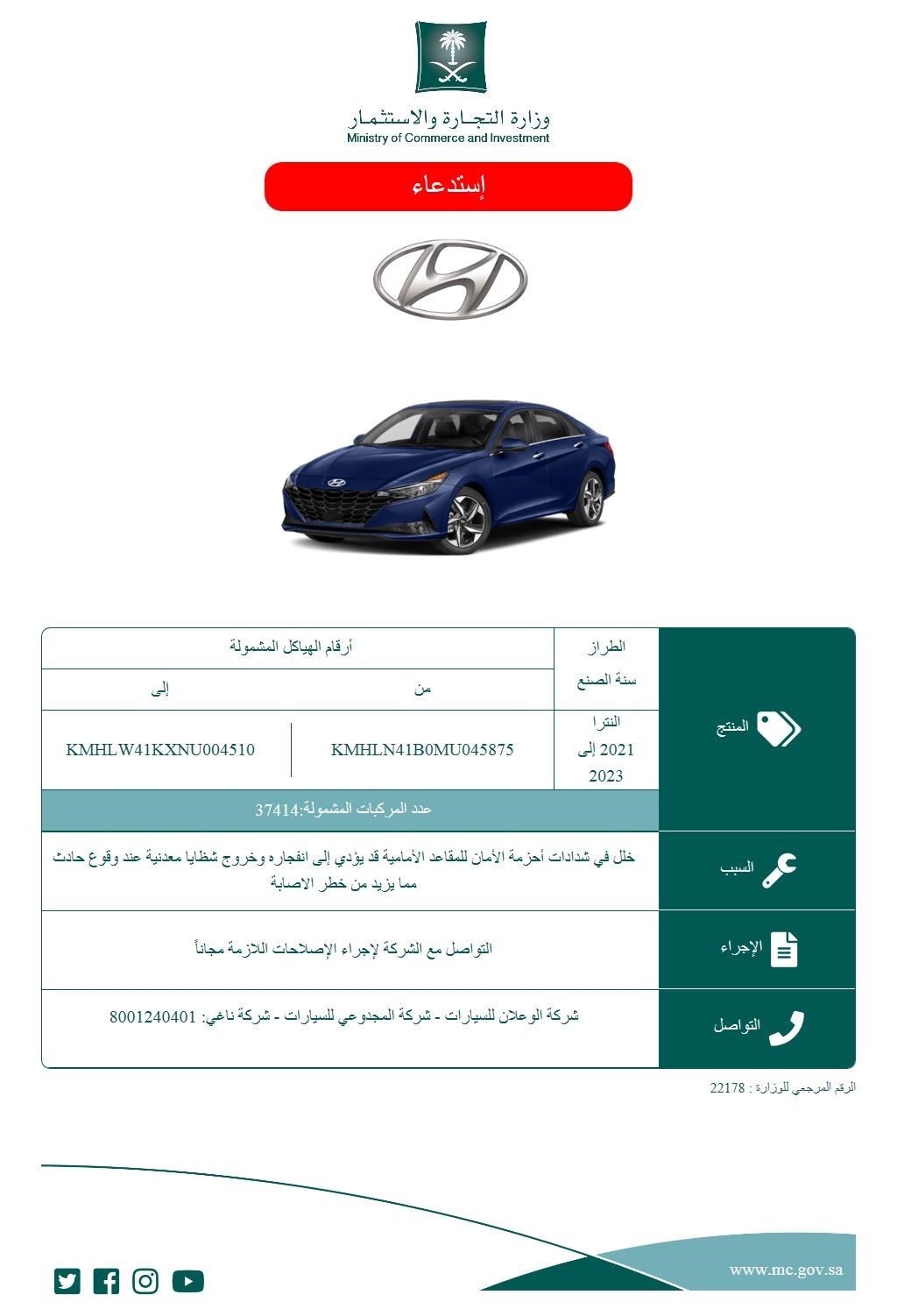 وقد طالبت الوزارة ملاك السيارة المعنيين بالاستدعاء بالتواصل مع وكلاء العلامة الكورية "هيونداي" في المملكة وهم، شركة الوعلان للسيارات، وشركة المجدوعي للسيارات، وشركة محمد يوسف ناغي.. موضحةً في منشورها أرقام الهواتف الاصة بكل وكيل، والتي جاءت على النحو التالي: