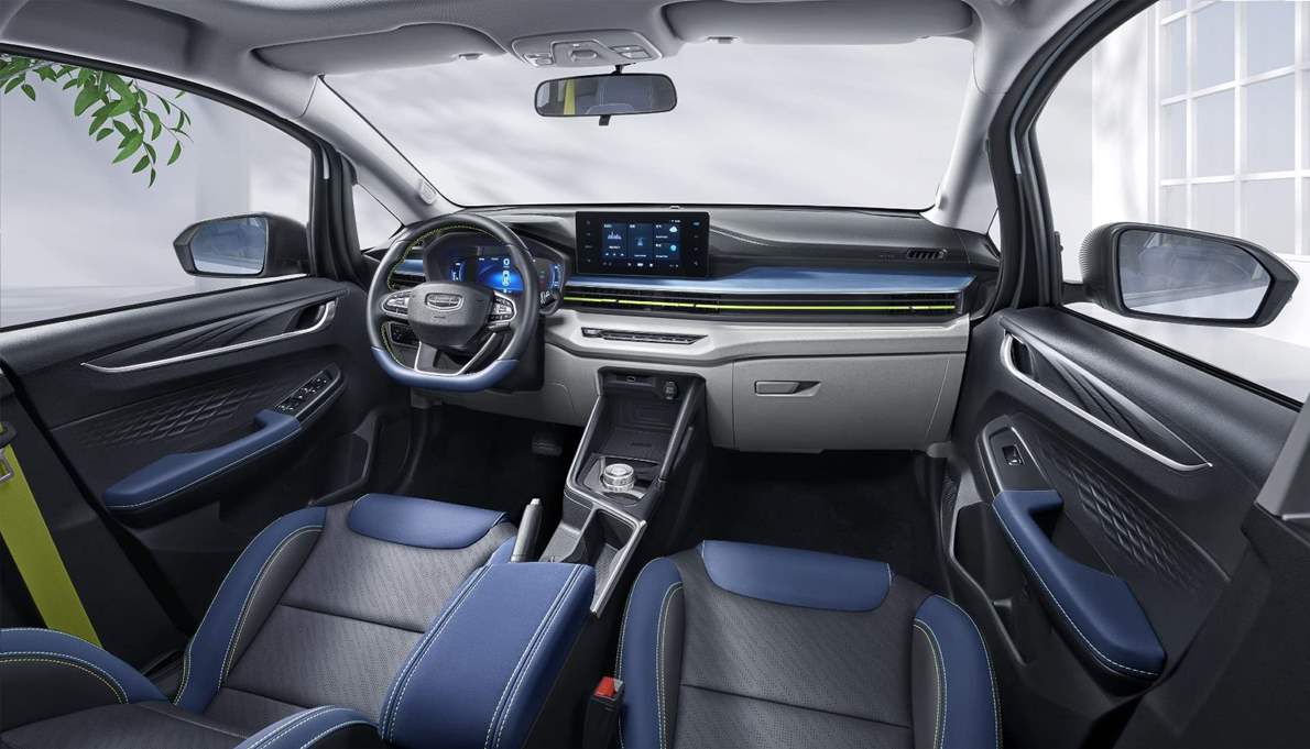 تبدو لوحة القيادة حديثة إلى حد ما بالنسبة إلى سعر السيارة، مع مجموعة عدادات رقمية مقاس 10.25 بوصة وشاشة تعمل باللمس للترفيه والإعلام مقاس 8 بوصات. يشتمل نظام المعلومات والترفيه G-Link من جيلي على موسيقى QQ و Autonavi وراديو Ximalaya والتحكم الصوتي وWi-Fi وتطبيقات أخرى. يتم الجمع بين التنجيد الأسود والأزرق مع لمسات مضيئة ومواد تشبه الجلد المدبوغ.