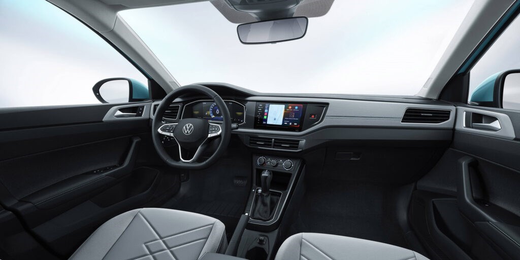 ونفس الوضع بالنسبة للمقصورة الداخلية، حيث تظهر تغييرات طفيفة مقارنة بـ "فيرتوس"، فيما تتشابه لوحة القيادة إلى حد كبير مع الهاتشباك "بولو"، ومن ضمن التجهيزات تأتي شاشة رقمية للعدادات مقاس 8 بوصة، مع شاشة أخرى تعمل باللمس للترفيه وعرض البيانات مقاس 8 بوصة هي الأخرى، ويتوفر لون الفرش الداخلي بخيارات مخصصة للسوق الصيني أيضًا كما في ألوان الطلاء الخارجي، يتخلله ألوان تركواز أو أزرق أو رمادي.