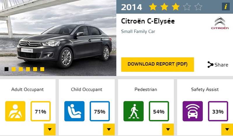 بالنظر إلى أن سيتروين C إليزيه هي سيارة في الأساس اقتصادية وموجهة إلى الأسواق النامية، فهذا أدى إلى عدم استثمار مبالغ كبيرة في مجال الأمان بالنسبة لها، وهو ما جعلها تحصل على ثلاثا نجوم فقط من خمسة في اختبارات التصادم الأوروبية، لكن بالنسبة لطراز نيسان فهو لم يخضع للنسخة الأوروبية من الاختبار بل خضع للآسيوية منها وحققت أربعة نجوم.