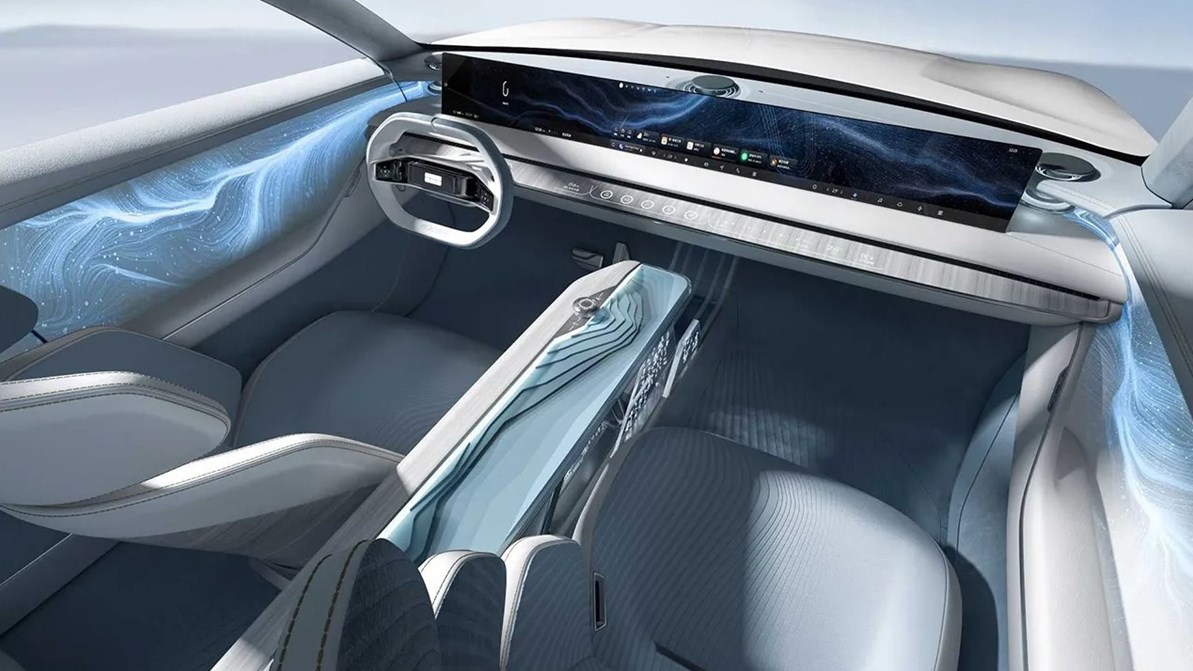 تحتوي لوحة العدادات على شاشة أفقية كبيرة تمتد إلى الراكب الأمامي، دون الاتصال بنفق مركزي.. والإضاءة المحيطة تكسب المقصورة إحساسًا بالمستقبل.