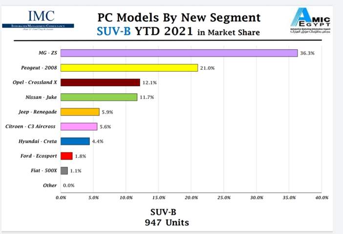 ووفقًا لـ "أميك" استحوذت سيارة إم جي ZS على المركز الأول بنسبة 36,3% ما يعادل 344 وحدة، تلاها في المركز الثاني سيارة بيجو 2008 بنسبة 21% أي بعدد وحدات بلغ 199 وحدة.