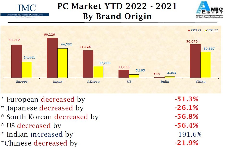 وكما أشرنا حصلت السيارات التي منشأها (كوريا الجنوبية) على النسبة الأعلى في تراجع المبيعات حيث بلغت نسبة تراجع مبيعاتها 56.8% مقارنةً بمبيعات عام 2021، وبشكل أخص، العلامتين "هيونداي" و"كيا".. وذلك وفقًا للتقرير الصادر من مجلس معلومات سوق السيارات (أميك - AMIC ) وتليها مباشرة بفارق بسيط السيارات أمريكية المنشأ، التي انخفضت مبيعاتها بنسبة 56.4% مقارنةً بعام 2021 وتضم ثلاث علامات هم "شيفرولية" و"فورد" و"جيب".
