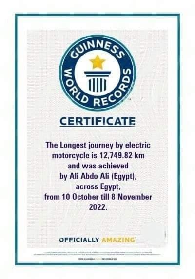 وقد تحقق الرقم الأول للمغامر المصري بتسجيله "أطول رحلة على دراجة كهربائية داخل دولة"، وذلك بعد أن قطع مسافة 9,759 كيلو خلال 22 يوما من انطلاق الرحلة، وهو رقم قياسي جديد أول مرة يتم تسجيله في موسوعة جينيس للأرقام القياسية.