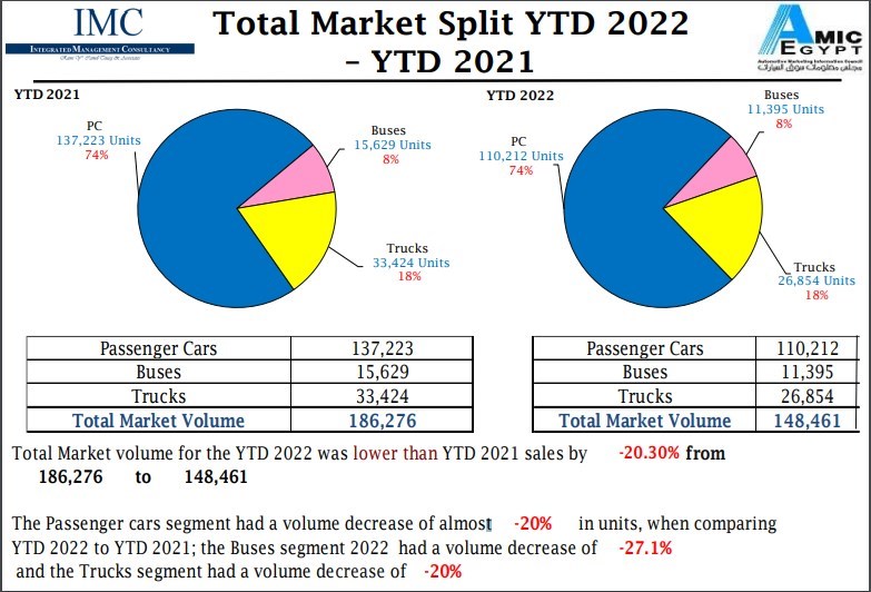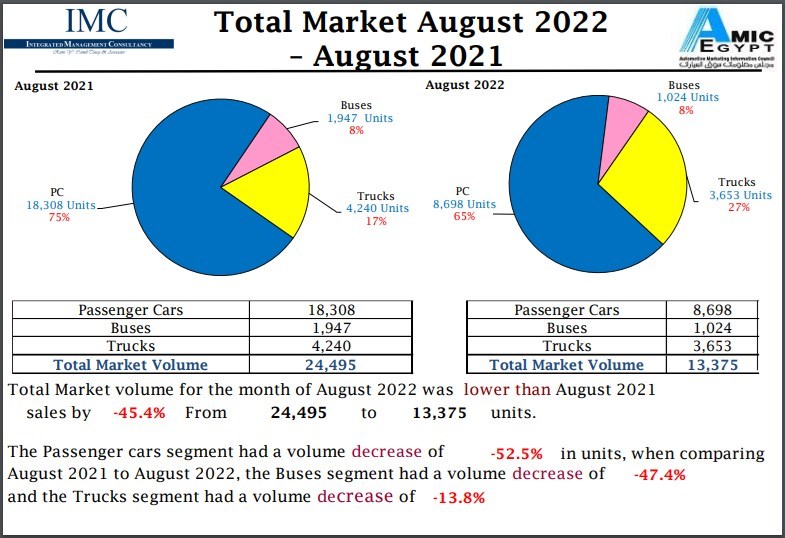 وتشير الأرقام إلى الانخفاض الملحوظ في إجمالي مبيعات الفئات الثلاثة معا (الملاكي والحافلات والشاحنات)، بنسبة تصل إلى 20.3% من يناير وحتى أغسطس مقارنة بنفس الفترة العام الماضي.