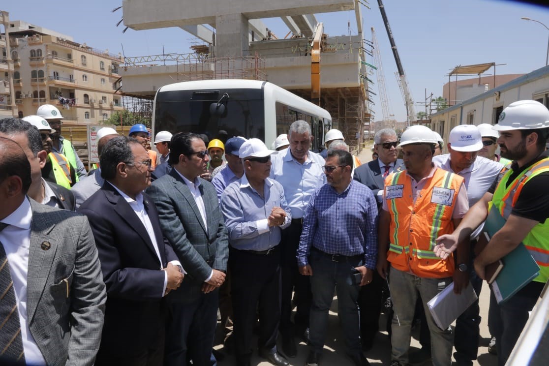 ثم توجه وزير النقل والوفد المرافق له لتفقد قطاعات المشروع المختلفة وذلك لمتابعة تنفيذ أعمال الأعمدة والكمرات وتركيبات ممشى الصيانة والطوارئ والمحطات على طول المسار حيث بلغت نسبة التنفيذ الإجمالية 48.4% (51% الأعمال المدنية " تشمل التنفيذ والتوريدات والتصميم" - 46% الأعمال الكهروميكانيكية) حيث يجرى حالياً أعمال تركيب الكمرات بالمسار بنسبة 60.3% وللمحطات بنسبة 58.3% والتحويلات بنسبة 44.4% ويجرى تنفيذ الأعمال المدنية بالمحطات بنسبة 41.2% كما يجري تصنيع المعدات بنسبة 56% ويتم إجراء الإختبارات عليها تباعاً كما تجرى أعمال التوريدات للمعدات الكهروميكانيكية بنسبة 38%،