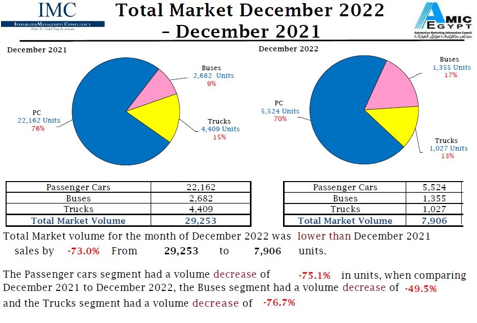وبشكل أكثر تفصيلًا، حدد التقرير انخفاض العدد الإجمالي لعدد الوحدات المباعة (سيارات ملاكي، وباصات وسيارات نقل) من 29,253 وحدة مباعة في ديسمبر 2021 إلى 7,906 وحدة فقط في ديسمبر 2022.