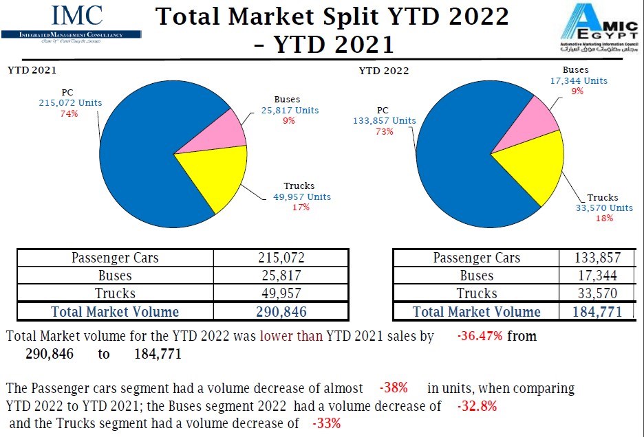 وبنظرة فاحصة على أداء مبيعات السوق المصري خلال فترة الـ 12 شهرًا الماضية (عام 2022) مقارنةً بالعام 2021، يمكن استنتاج الانخفاض الحاد والواضح، فقد بلغت المبيعات الإجمالية خلال العام 2021 نحو 290,846 مركبة، في حين انخفضت هذه المبيعات لـ 184,771 مركبة في عام 2022، وهو ما يمثل انخفاض في المبيعات بالمقارنةً بين العامين 2021 و2022 نسبته 36.47%.
