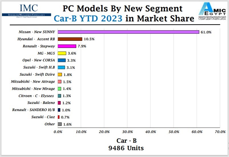 تصدرت السيارة اليابانية "نيسان صني" المجمعة محليا، قائمة مبيعات الفئة الاقتصادية Car-B في السوق المصري، بعدما استحوذت على حصة سوقية 61 % محققة مبيعات 5,785 سيارة من إجمالي مبيعات 9,486 سيارة، وذلك خلال الشهور السبع الأولى من العام الجاري 2023.