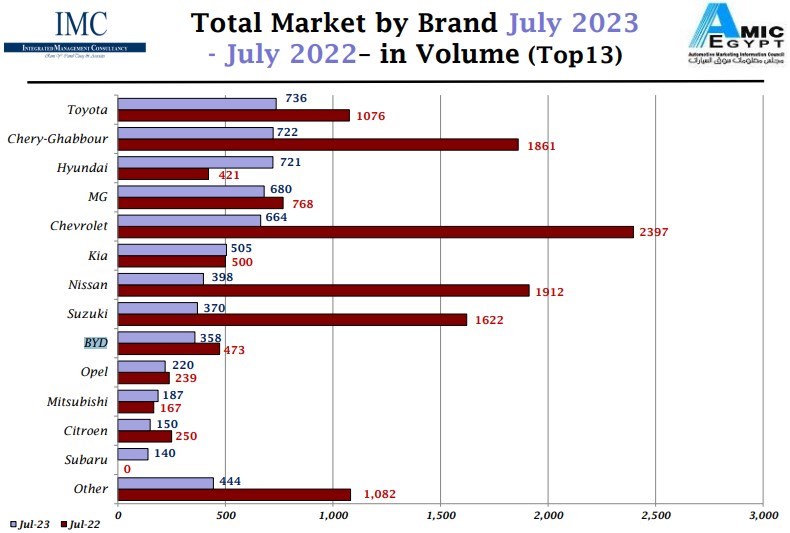 وفي المرتبة الرابعة، سجلت شقيقتها الصينية "إم جي" 680 سيارة فقط بنسبة 11% أيضا خلال يوليو 2023 حيث تراجعت مبيعاتها مقابل 768 تم تسجيلها في نفس الشهر 2022، ويليها في المرتبة الخامسة العلامة الأمريكية "شيفرولية" والتي تراجعت مبيعاتها بشكل ملحوظ حيث سجلت 664 سيارة بنسبة 11% مقابل 2,397 سيارة.