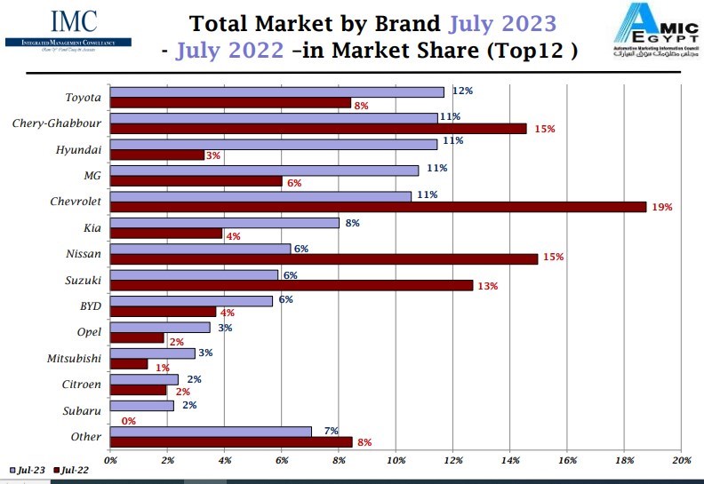 وتأتي العلامة الكورية "كيا" في المرتبة السادسة بنسبة استحواذ 8% ومبيعات 505 سيارة، أما عن المرتبة السابعة فكانت من نصيب "نيسان" والتي هبطت مبيعاتها بشكل حاد خلال يوليو هذا العام ووصلت إلى 398 سيارة بنسبة 6% مقابل 1,912 سيارة خلال نفس الشهر العام الماضي.