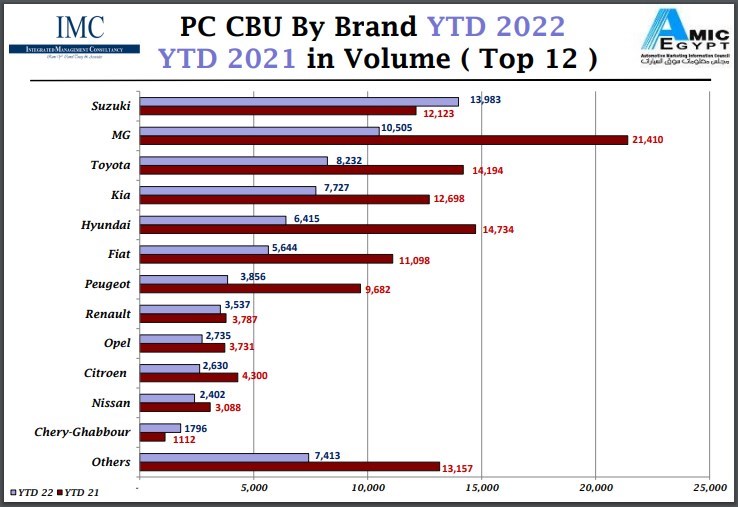 ووفقا للتقرير الصادر عن مجلس معلومات سوق السيارات "أميك-AMIC"، تأتي "إم جي" في المركز الثاني بمبيعات 10,505 سيارة ونسبة استحواذ 13.7%، وكانت "MG5" على رأس الطرازات الأكثر مبيعا للعلامة الصينية محققة مبيعات 4,350 سيارة.