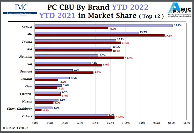 احتلت العلامة اليابانية "سوزوكي" رأس قائمة السيارات (الملاكي) المستوردة الأكثر مبيعا في السوق المحلي، وذلك بعدما سجلت مبيعات نحو 13,983 سيارة بنسبة 18.2% خلال الفترة من يناير حتى أكتوبر العام الجاري.. وحصدت "سويفت ديزاير" النصيب الأكبر من مبيعات العلامة اليابانية والتي بلغت 5,178 سيارة.
