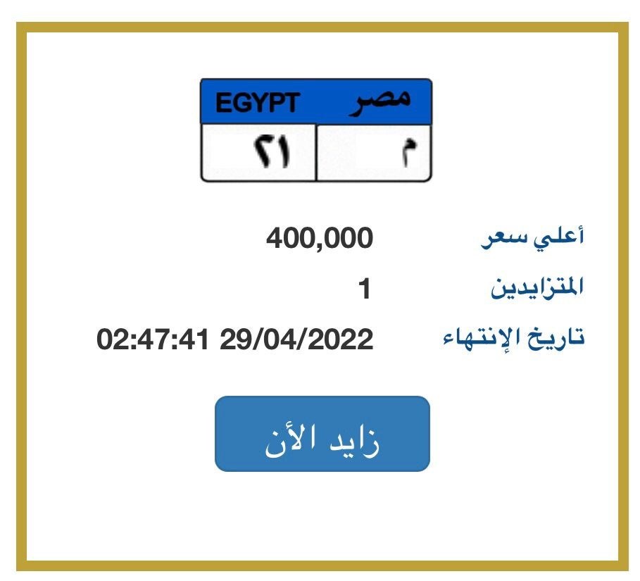 وطرح الموقع لوحات ينتهي تاريخ المزايدة عليها اليوم 27 إبريل 2022 وأخرى بتاريخ 29 إبريل الحالي.. وتنتهي المزايدات في بعض اللوحات في حدود الساعة الـ 6:30 مساء اليوم وأخرى ممتدة حتى الـ 3 ظهر يوم الجمعة 29 إبريل.
