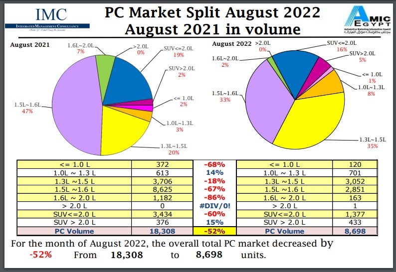 شهدت مبيعات سيارات الركاب (الملاكي) في السوق المصري تراجعا ملحوظا وصلت نسبته إلى 52% خلال شهر أغسطس من العام الجاري 2022، مسجلة نحو 8,698 سيارة مقابل 18,308 سيارة خلال نفس الشهر من العام الماضي 2021.