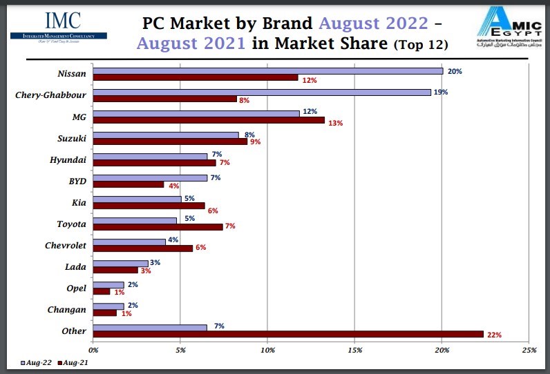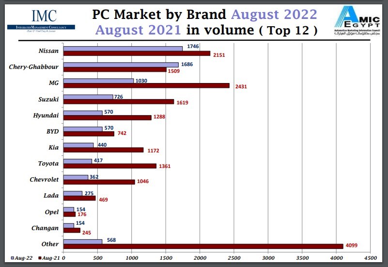 ووفقا للتقرير الشهرى الصادر عن مجلس معلومات سوق السيارات "أميك-AMIC"، تصدرت العلامة اليابانية "نيسان" قائمة السيارات الملاكي الأكثر مبيعا في مصر خلال أغسطس، حيث تمكنت من رفع مبيعاتها مقابل نفس الشهر العام الماضي واستحوذت على 20% من إجمالي الحصة السوقية، محققة مبيعات 1746 سيارة.
