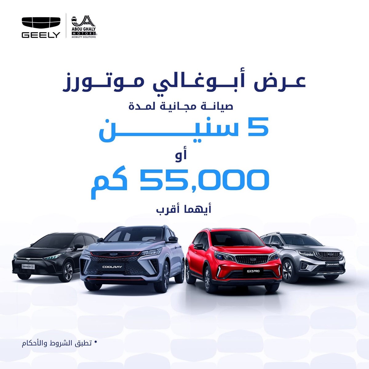 أعلنت مجموعة "أبو غالي موتورز" وكيل علامة "چيلي Geely" بالسوق المصري عن عرض خاص يشمل صيانة مجانية لمدة 5 أعوام أو 55.000 ألف كيلومتر على جميع سيارات جيلي المقدمة في السوق المصري.