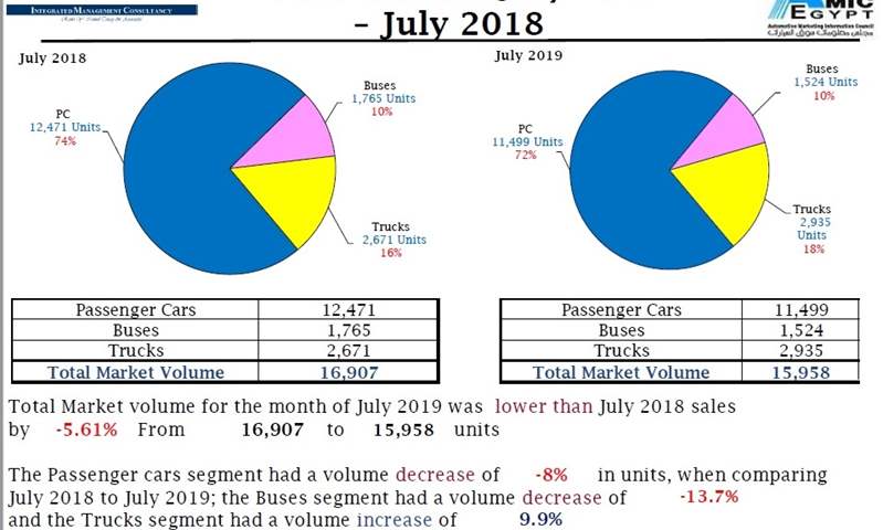 اصدر مجلس معلومات سوق السيارات المصري (الأميك) تقريره الجديد عن مبيعات السوق الكلية من السيارات خلال الفترة شهر يوليو 2019 والذى شهد أنخفاضا مقارنةً بمبيعات نفس الفترة من العام الماضي 2018 بنسبة 6.51 % .