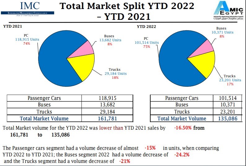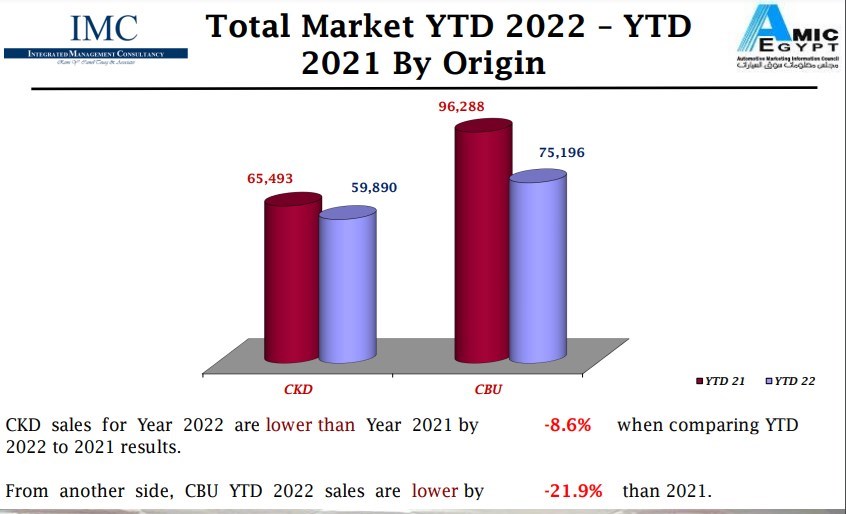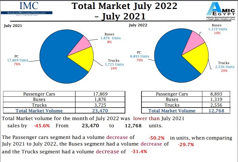 واصلت مبيعات المركبات المجمعة محليًا بالسوق المصري انخفاضها لتكون حصيلة السبع شهور  الأولى من العام الجاري 59,890 مركبة، مقابل 65.493 مركبة خلال نفس الفترة من العام الماضي، أي انخفاض نسبته 8.6% ، وذلك وفقًا للتقرير الصادر من مجلس معلومات سوق السيارات أميك -AMIC.