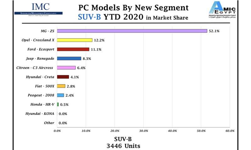 كما حققت سيارة إم جي ZS التي تنتمي لفئة السيارات الـ SUV نجاحاً ملحوظاً في السوق المصري خلال النصف الأول من العام الجاري، فقد تصدرت مبيعات السيارات من فئة SUV-B خلال النصف الأول من 2020 محققة مبيعات وصلت إلى 52.1% من إجمالي مبيعات هذه الفئة، حيث باعت 1769 وحدة، متفوقة على سيارة أوبل كروس لاند X التي جاءت في المركز الثاني 12.2%، وفورد إيكوسبورت التي احتلت المركز الثاني بنسبة 11.1%.