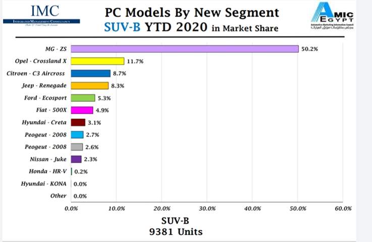 اقتنصت سيارة إم جي ZS نسبة50,2 % مبيعات السيارات الـ SUV-B في السوق المصر خلال العام الماضي 2021، أي ما يُعادل 4711 وحدة من إجمالي مبيعات تلك الفئة الذي بلغ 9381 وحدة، وذلك وفقًا لإحصائيات مجلس معلومات سوق السيارات "أميك" الصادر عن شهر ديسمبر الماضي.