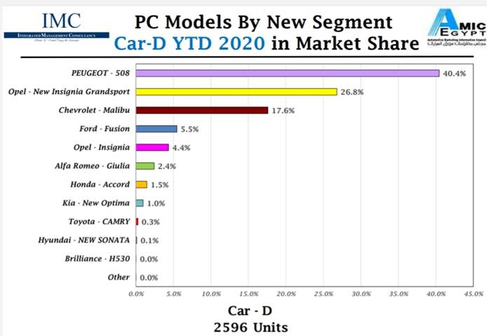بينما احتلت سيارة أوبل إنسيجنا جراند سبورت المركز الثاني بنسبة 26,8% ما يُعادل 696 وحدة، تلاها مباشرة في المركز الثالث سيارة شيفروليه ماليبو بنسبة 17,6% ما يساوي 457 وحدة.