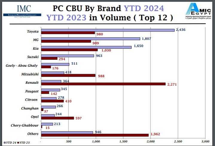 وتأتي العلامة اليابانية "تويوتا Toyota" على قمة مبيعات السيارات (الملاكي) المستوردة في السوق المصري خلال الفترة من يناير وحتى شهر مايو هذا العام حيث سجلت نحو 2,436 سيارة مستحوذة على 23.3% من إجمالي الحصة السوقية والتي ارتفعت مقارنة بنفس الفترة العام الماضي والتي سجلت خلالها 980 سيارة فقط.. واستحوذت "كورولا NG" على النصيب الأكبر من مبيعات الشركة مسجلة نحو 2,144 سيارة.