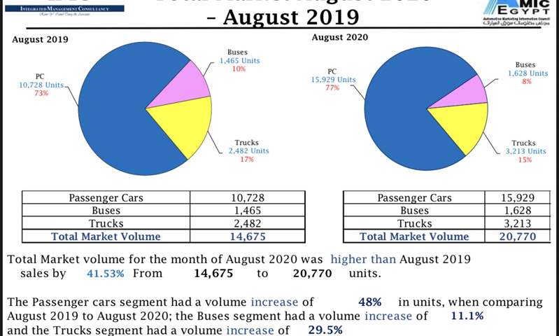 أما عن مبيعات السيارات في السوق المصري خلال شهر أغسطس الماضي فازدادت بنسبة 41.53% ببيع 20,770 وحدة، مقابل بيع 14,675 وحدة خلال شهر أغسطس 2019.