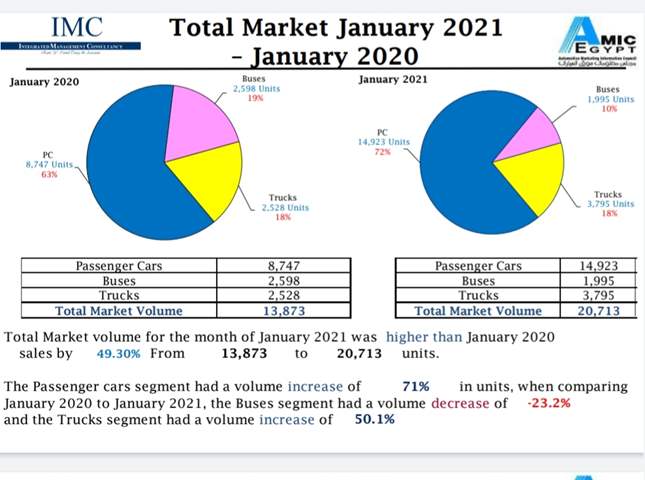 ووفقًا لـ "أميك" زادت مبيعات الشاحنات بنسبة 50,1% خلال يناير الماضي، حيث باعت 3,795 وحدة، مقابل 2,528 وحدة في نفس الشهر من عام 2020.