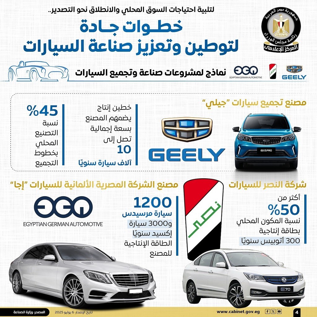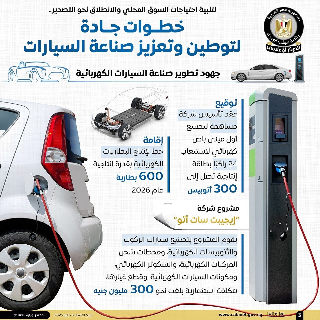 نشر المركز الإعلامي لمجلس الوزراء، عددًا من الإنفوجرافات عبر منصاته الرسمية على مواقع التواصل الاجتماعي، تسلط الضوء على الخطوات الجادة التي تتخذها الدولة لتوطين وتعزيز صناعة السيارات، بما يلبي احتياجات السوق المحلي، ويعزز القدرة التصديرية.