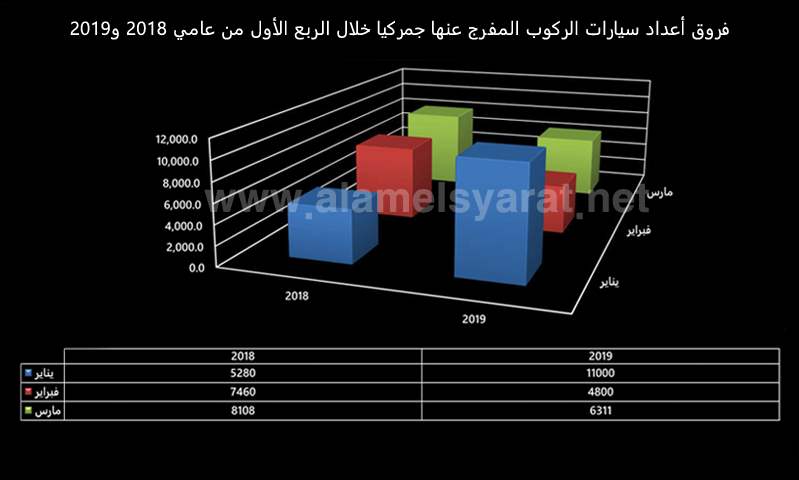 يوضح الشكل السابق أعداد سيارات الركوب المفرج عنها خلال الربع الأول من 2019 مقارنة بالربع الأول من 2018, ويمكن ملاحظة بعض النقاط من خلاله: