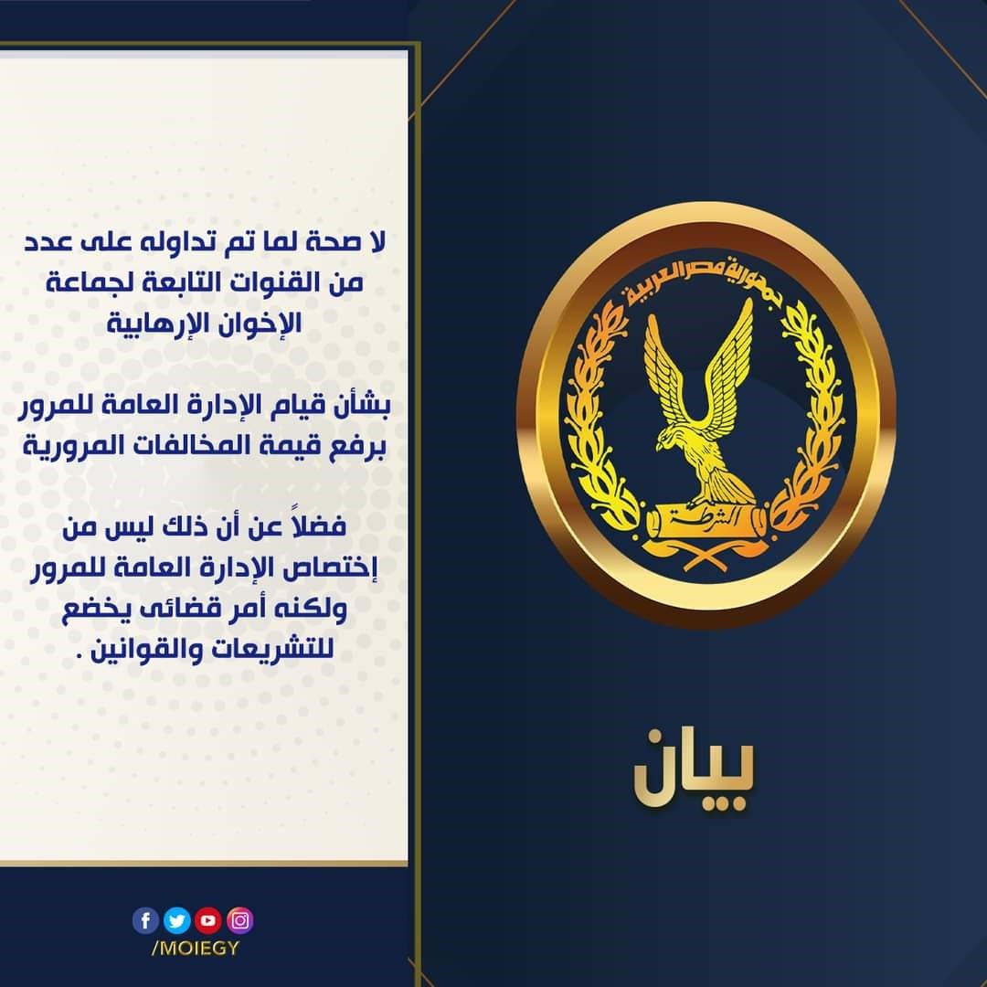 وقالت الوزارة في بيانها عبر صفحتها الرسمية على "فيس بوك"، أنه لا صحة لما تداوله على عدد من القنوات التابعة لجماعة الإخوان الإرهابية، بشأن قيام الإدارة العامة للمرور برفع قيمة المخالفات المرورية.