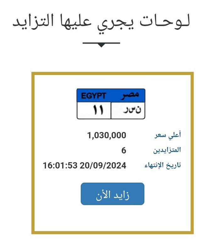 وكانت أبرزها لوحة تحمل حروف وأرقام (ن س ر 11) والتي بلغ عدد المتزايدين عليها 6 أشخاص ووصل سعرها إلى مليون و30 ألف جنيه ومن المقرر أن ينتهي التزايد عليها غدا الموافق 20 سبتمبر 2024 في حوالي الساعة الرابعة مساءً.