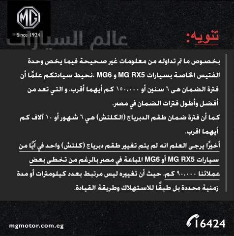 وأوضح الوكيل أن ضمان سيارات MG تمتد إلى 6 سنوات أو 150,000 كم أيهما يأتي أولاً، وهو ضمان من أطول الضمانات في السوق المصري، وأوضح أيضاً أن الضمان الخاص بطقم الدبرياج الخاص بالناقل المذكور هو لمدة 6 أشهر أو 10,000 كم أيهما يأتي أولاً.