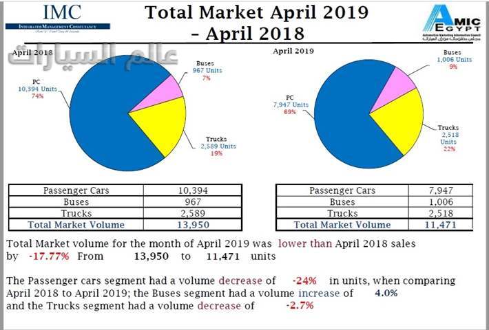 وبتدقيق فى ارقام شهر أبريل نلاحظ ان السيارات الملاكى كان لها النصيب الأكبر من الأنخفاض فى حجم المبيعات بنسبة 24% بحجم مبيعات 7.947 سيارة مقابل 10.394 سيارة خلال نفس الفترة من العام الماضى , لم يختلف الأمر كثيرا فى مبيعات الشاحنات التى أنخفضت بنسبة 2.7 % مسجلة حجم مبيعات 2.518 وحدة مقابل 2.589 وحدة خلال نفس الفترة من العام الماضى ولكن على مستوى الأوتوبيسات الأمر أختلف فقد سجلت بيع 1,006 أوتوبيس بأرتفارع 4% عن نفس الفترة من العام الماضى والتى بلغت 967 أوتوبيس .