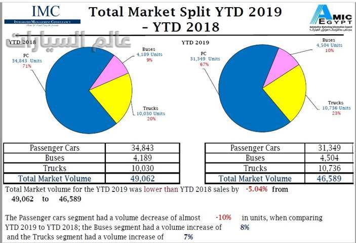 يشير التقرير إلى أن مبيعات السوق الإجمالية بمختلف قطاعاته (سيارات ملاكى – أتوبيسات – شاحنات) بلغت 46589 وحدة بأنخفاض 5.04% عن مبيعات نفس الفترة من العام الماضي والتى بلغت 49.062 وحدة.